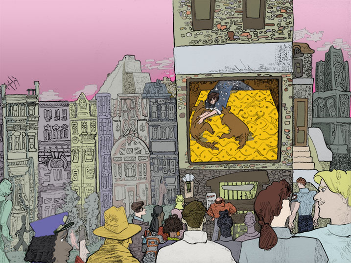 up on the roofs, pencil with digital coloring, 2020. | |||