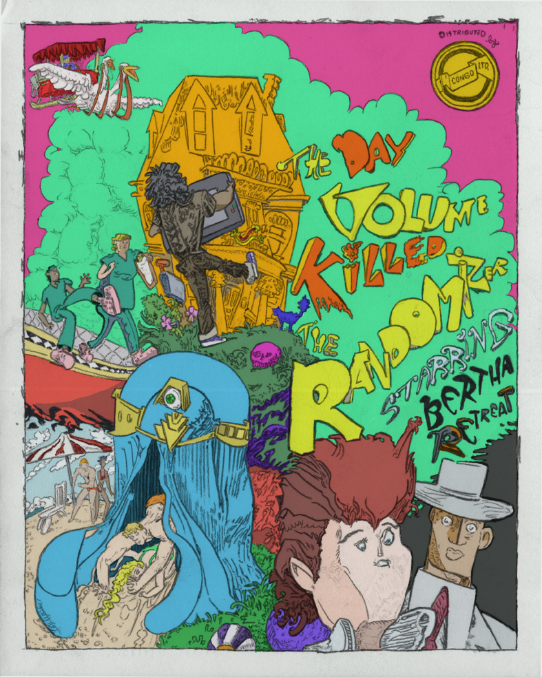 The Day Volume Killed the Randomizer, faux cinema poster, ballpoint pen with digital coloring, 2016. |