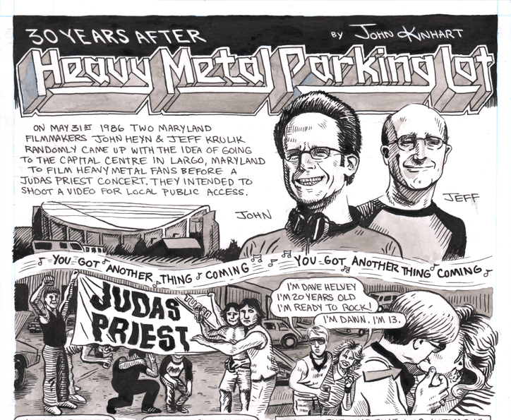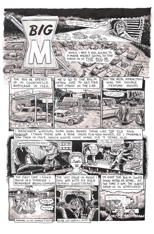 AG: There are two film-related comics in this issue of EXIT – one about the 1986 film Heavy Metal Parking Lot, and one about your personal history with a drive-in theater. Both the film and venue are lost to time, but specific to Maryland. What compels you to offer these sorts of histories? |