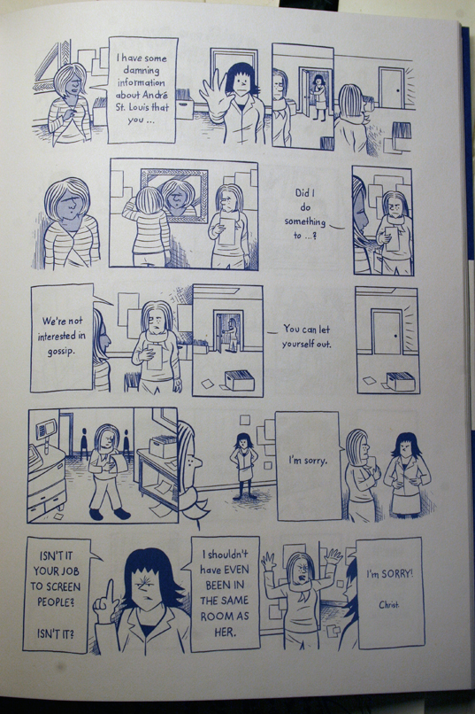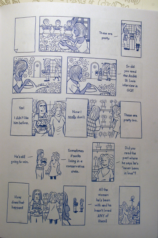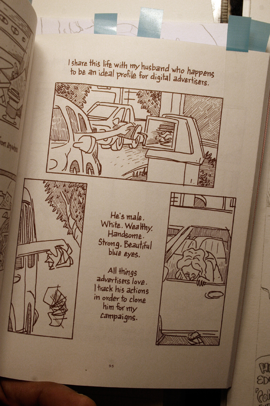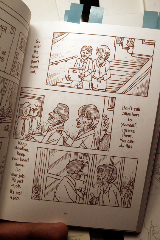 AG: There’s a particular theme of avoidance in this story -- the way you’ve structured the panels is so simple but gives leeway to so many details. None of the characters seem to ever have to talk to each other directly because of the politics in play. |