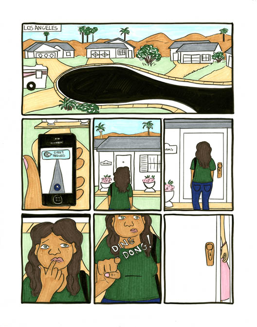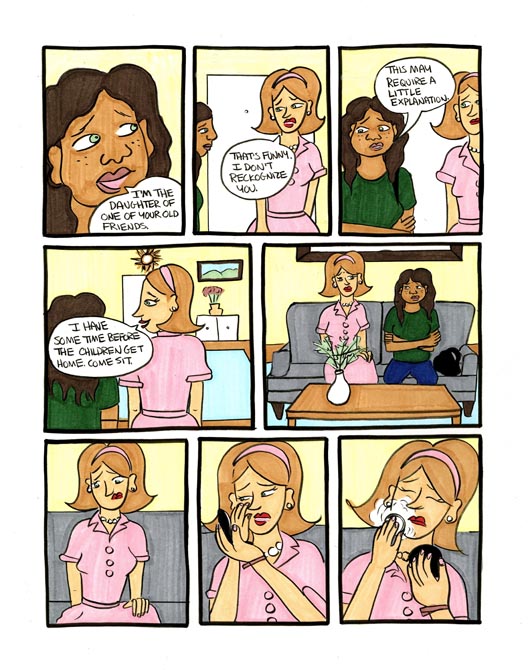 WT: Passing is based off of a screenplay I wrote back in college. I think it was the original made-for-film format which made the words play a supporting role to the environment. I'm not done drawing that story and hope to complete it at graphic novel size some time in the future. Wallpaper was more of an experiment. I was super busy this summer working on a longer, more research-heavy project and just wanted to go home and draw patterns to relax. After a while I came up with the idea of pairing a story with the patterns and letting them tell the story without the use of actual characters. In both cases, I don't think these stories work best in webcomics format.